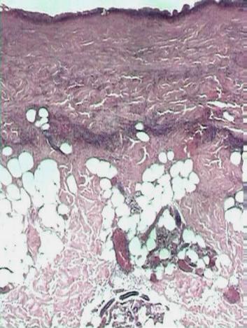 Микроскопически обнаруживают (рис. 71), что вся толща эпидермиса и верхняя часть дермы некротизирована, а пузыри, в отличие от пузырей при ожогах II степени, образованы в результате отслоения всего пласта эпидермиса, включая базальный слой с его мембраной. В дне раны сохранены фрагменты волосяных фолликулов и сальных желез, потовые железы и участки их прото- ков. Возможны очаги кровоизлияний.