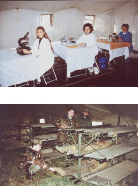 В гистологической лаборатории (рис. 4) три лаборанта-гистолога изго- тавливают микропрепараты. При необходимости оформления фототаблиц для протоколов вскрытий часть палатки отгораживают под фотолабораторию.