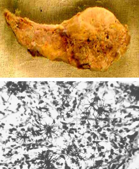 торые испускают альфа-лучи (видны радиоактивные треки, исходящие из опухо- левых клеток) (фото-