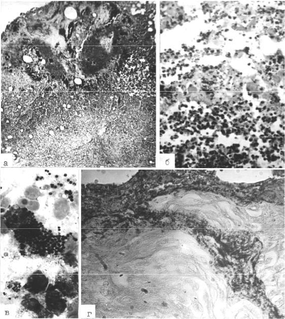 Рис. 24. Стафилококковая гнойная раневая инфекция (окраска азуром II и эозином — а, б, по Граму — в, по Граму-Вейгерту — г): а — очаг инфекции Staphylococcus aureus в ране с диапедезными кровоизлияниями и распростра- нением гнойно-деструктивного процесса в глубину тканей (× 75); б — некроз