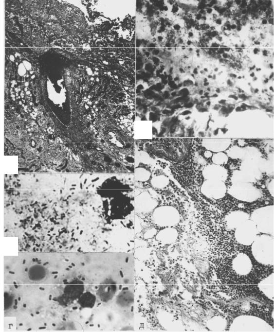 Рис. 25. Синегнойная и энтеробактериальная гнойные раневые инфекции (окраска гематоксилином и эозином — а, д, азуром II и эозином — б, в, г): а — очаг синегнойной инфекции с явлениями гнойного тромбоваскулита и распро- страненным некрозом в гранулирующей ране (× 100); б — скопления грамот- рицательных палочек Pseudomonas aeruginosa (синегнойной палочки) в мазке отпечатке из той же раны (×1000); в — очаг энтеробактериальной инфекции в ране со скоплением лейкоцитов вокруг некроза с прорастающими его коли- формными микробами (палочками) (× 400); г — грамотрицательные палочки (энтеробактерии) в мазке-отпечатке из той же раны (× 1000); д — парафасци-