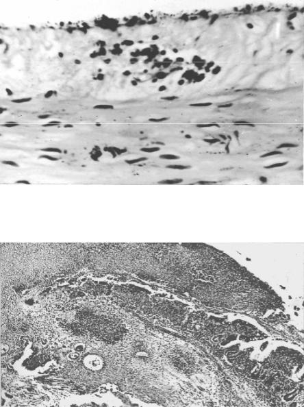 вамация мезотелия в месте отложения ино- родных частиц на сероз- ной оболочке; отек под- лежащей соединитель- ной ткани и периваску- лярная лимфо- макрофаго-цитарная ин- фильтрация; 0,5 ч после ранения (окраска азуром II и эозином, × 300)