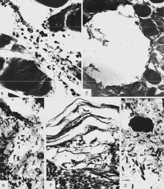 — анаэробный миозит с некрозом мышечных волокон на удалении от края раны. В отечном эндомизии — крупные грамположительные палочки (клостридии) (× 300); б — газовый пузырь среди скопления клостридий в некротизированной мышечной ткани (× 75); в — анаэробный целлюлит с наличием клостридий в глубине некротизированной жировой клетчатки (× 500); г — некроз и демарка- ционная лейкоцитарная инфильтрация в крае раны (× 250); д — полиморфная грамположительная и грамотрицательная (бледно окрашенная) микробная флора среди некротического детрита в мазке-отпечатке с поверхности раны (× 1000)