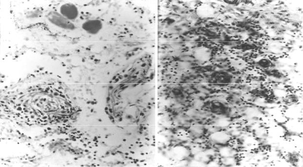 Рис. 29. Стрептококковая анаэробная инфекция в огнестрельной ране бедра, 7-е сутки после ранения (окраска азуром II и эозином, × 150): а — некроз мягких тканей в месте инвазии возбудителей на удалении 20 см от раневого ка- нала, серозно-лейкоцитарный инфильтрат; б — некротический тромбоваскулит