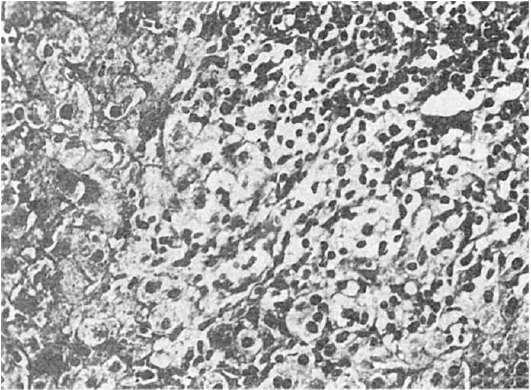 чатых ретикулоэндотелиоцитов значительно увеличено. Клетки инфильтрата выходят из портальной стромы в паренхиму дольки и разрушают гепатоциты пограничной пластинки, что ведет к появлению перипортальных ступенчатых некрозов. В различных отделах долек много переполненных желчью капилляров.