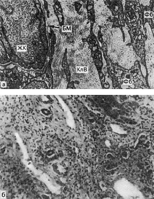 а - разрастание фибробластов (Фб) и коллагеновых волокон (КлВ) между гепатоцитами; ЖК - желчный капилляр; БМ - базальная мембрана капилляра. Электронограмма. х14 250 (по Штайнеру); б - несколько триад в поле соединительной ткани (микроскопическая картина)