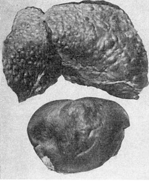 220. Постнекротический цирроз. Поверхность печени крупнобугристая. Внизу увеличенная вследствие цирроза селезенка