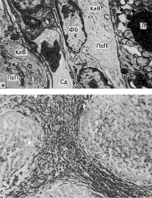 а - фибробласты (Фб) и пучки коллагеновых волокон (КлВ) в перисинусоидальном пространстве (ПсП); синусоид (СД) сдавлен; в цитоплазме гепатоцитов капли липидов (Л). Электронограмма. х6000 (по Давиду); б - ложные дольки разделены узкими прослойками соединительной ткани, инфильтрированной лимфоцитами и макрофагами (микроскопическая картина)
