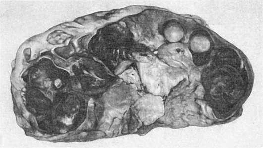 Патологическая анатомия. Поликистозные почки напоминают большие виноградные гроздья. Ткань их состоит из множества кист различной величины и формы, заполненных серозной жидкостью, коллоидными массами или же полужидким содержимым шоколадного цвета. Кисты выстланы кубическим уплощенным эпителием. Иногда в стенке кисты находят сморщенный сосудистый клубочек. Почечная ткань между кистами атрофирована. Нередко поликистоз почек сочетается с поликистозом печени, поджелудочной железы и яичников.