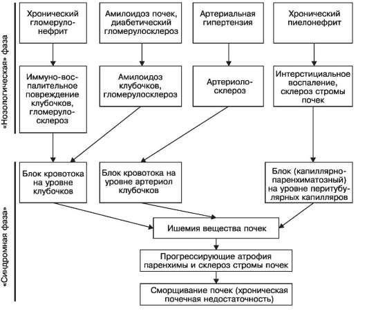 Пато- и морфогенез. В пато- и морфогенезе нефросклероза можно выделить две фазы: первую - «нозологическую» и вторую - «синдромную». В первой фазе склероз почек обусловлен особенностями пато- и морфогенеза заболевания, при котором нефросклероз развивается. Во второй фазе патоморфологические и клинико-морфологические особенности нозологии сглаживаются, а иногда утрачиваются, ведущим становится синдром хронической почечной недостаточности. Нефросклероз в первой фазе, которая охватывает период до формирования блока почечного кровотока на одном из структурных уровней почки (артериолярном, гломерулярном, интерстициальном), является компонентом морфологических проявлений основного заболевания. Нозологическая специфичность его определяется преимущественным вовлечением в склеротический процесс одного из структурных элементов почки (артериолы, клубочки, интерстиций), а также качественными особенностями склеротических изменений почки (схема XXII). Во второй фазе нефросклероз связан с формированием блока почечного кровотока на уровне той или иной структуры (артериолярный, гломерулярный, капиллярно-паренхиматозный блок), который включает гипоксический фактор, определяющий дальнейшее прогрессирование нефросклероза (см. схему XXII). Склерозу подвергаются в равной мере все структурные элементы почки, в связи с чем морфологические признаки нозологии сглаживаются.