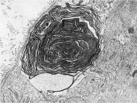 Своеобразным изменением плазмолеммы, встречающимся не только при нарушении ее проницаемости, является образование миелиноподобных структур (рис. 24). Эти структуры появляются в связи с перекисным окислением липидов мембран, усиливающимся под воздействием разных агентов. Высвобождающиеся из разрушающихся при перекисном окислении мембран фосфолипиды (дезагрегация и реагрегация мембраны) образуют сложные миелиноподобные структуры. Подобные структуры появляются и при скручивании удлиненных цитоплазматических отростков.