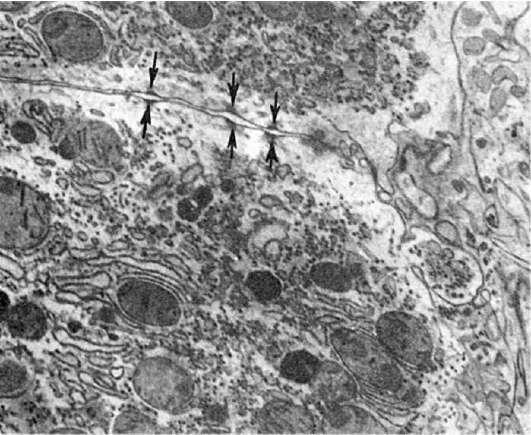 Рис. 25. Расхождение десмосомальных контактов между гепатоцитами (показано стрелками) вблизи желчного канальца при первичном билиарном циррозе. х23 500