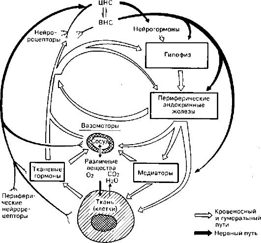 Под трофикой понимают совокупность механизмов, определяющих метаболизм и структурную организацию ткани (клетки), которые необходимы для отправления специализированной функции. Среди этих механизмов выделяют клеточные и внеклеточные (рис. 26). Клеточные механизмы обеспечиваются структурной организацией клетки и ее ауторегуляцией. Это значит, что трофика клетки в значительной мере явля-