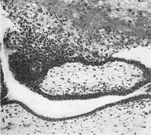 При трубной беременности в слизистой оболочке трубы, где прикрепляется и формируется яйцо, развиваетсядецидуальная реакция, которая характеризуется появлением как в слизистой оболочке, так и в стенке трубы крупных и светлых децидуальных клеток. В слизистой оболочке появляется также ворсинчатая оболочка плода, причем ворсины хориона проникают в мышечный слой и его сосуды, разрушая тканевые элементы трубы (рис. 239). В связи с этим в первые месяцы трубной беременности возможно кровотечение в полость трубы и выделение плода в полость трубы - неполный трубный аборт. Погибший плод и его оболочки, пропитанные кровью, выбрасываются через фимбриальный конец в брюшную полость - полный трубный аборт.