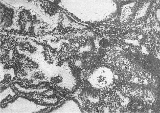 Тиреоидиты. Это группа заболеваний, среди которых основное значение имеет тиреоидит Хасимото, или болезнь Хасимото - истинное аутоиммунное заболевание. Аутоиммунизация связана с появлением аутоантител к микросомальному антигену и поверхностным антигенам тиреоцитов, а также тиреоглобулину. Аутоиммунный процесс, детерминированный антигенами гистосовместимости DR, ведет к диффузной инфильтрации ткани железы лимфоцитами и плазматическими клетками (см. рис. 80), образованию в ней лимфоидных фолликулов. Паренхима железы в результате воздействия преимущественно иммунных эффекторных клеток погибает, замещается соединительной тканью. В далеко зашедших случаях морфологическая картина может напоминать тиреоидит (зоб) Риделя.