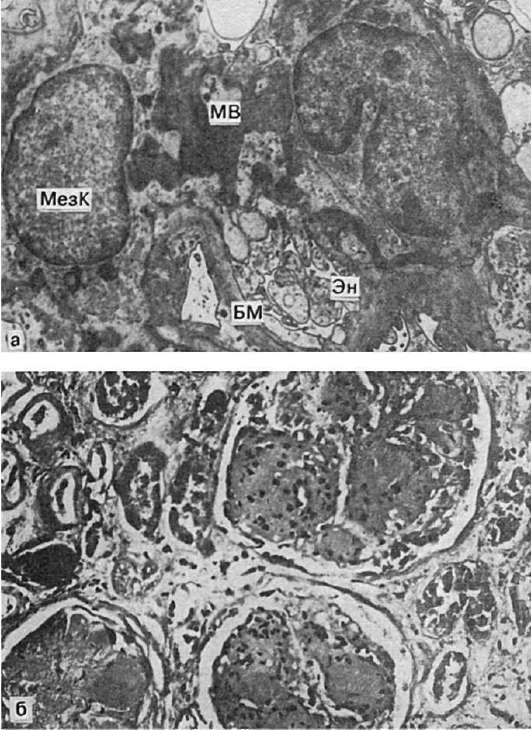 а - отложения мембраноподобного вещества (MB), окружающие мезангиальные клетки (МезК); базальные мембраны (БМ) не утолщены; Эн - эндотелий капилляра. Электронограмма. х10 000; б - микроскопическая картина; очаговый склероз и гиалиноз мезангия