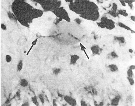 243. Паратиреоидная остеодистрофия. Лакунарное рассасывание кости (показано стрелками) и новообразование фиброзной ткани (по М. Эдер и П. Гедик)