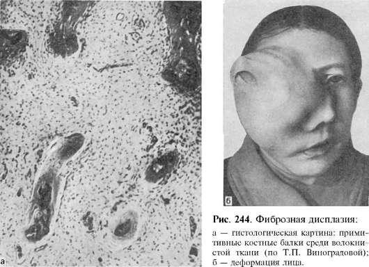 Патологическая анатомия. При монооссальной форме фиброзной дисплазии наиболее часто поражены ребра, длинные трубчатые кости, лопатки, кости черепа (рис. 244); при полиоссальной форме - свыше 50% костей скелета, обычно с одной стороны. Очаг поражения может захватывать небольшой участок или значительную часть кости. В трубчатых костях он локализуется преимущественно в диафизах, включая и метафиз. Пораженная кость в начале заболевания сохраняет свою форму и величину. В дальнейшем появляются очаги «вздутия», деформация кости, ее удлинение или