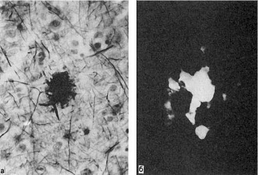 а - старческая бляшка; импрегнация серебром по Бильшовскому; б - анизотропия амилоида в поле поляризации. Окраска конго красным