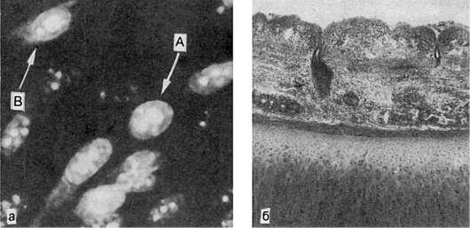 а - специфическая люминесценция вируса в ядрах (А) и перинуклеарной зоне (В); б - некротический трахеит