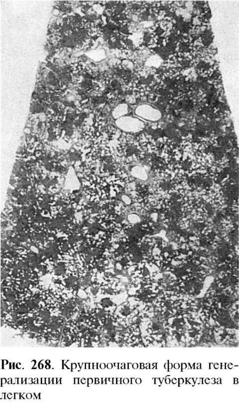 и крупноочаговую формы гематогенной генерализации (рис. 268). Особенно опасно высыпание милиарных туберкулезных бугорков в мягких мозговых оболочках с развитием туберкулезного лептоменингита. Иногда при гематогенной генерализации появляются единичные разной величины отсевы в различные органы, в том числе в верхушки легких (очаги Симона), которые спустя много лет после затихания первичной инфекции дают начало туберкулезному поражению в месте локализации этого очага отсева.