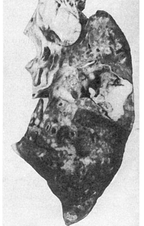 превращается в лобулярный, затем в сливной лобулярный, сегментарный, лобарный - возникает лобарная казеозная пневмония. Это самая тяжелая форма первичного туберкулеза, быстро заканчивающаяся гибелью больного («скоротечная чахотка»). В других случаях