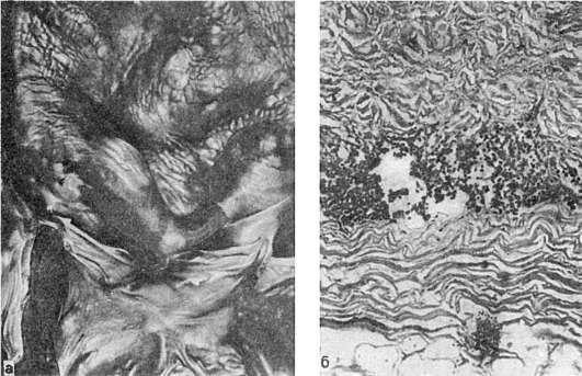 аорты, чаще непосредственно над клапанами. На интиме аорты появляются белесоватые бугристости с рубцовыми втяжениями, придающими аорте вид шагреневой кожи (рис. 279). Если присоединяется атеросклероз, то картина специфических изменений затушевывается. В типичных случаях изменения резко обрываются в дуге или в нисходящей части аорты. Брюшная аорта поражается очень редко.
