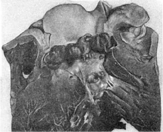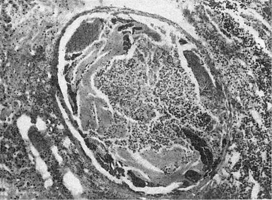 лимфангитом и лимфаденитом, причем ткань лимфатического узла нередко подвергается гнойному расплавлению. В области септического очага обнаруживается также гнойный тромбофлебит, который является источником тромбобактериальной эмболии. В связи с тем что источники последней появляются чаще в венах большого круга кровообращения, первые метастатические гнойники появляются в легких (рис. 283). Затем