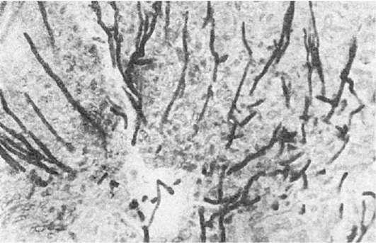 При локальном кандидозе наиболее часто поражаются слизистые обо- лочки, покрытые многослойным плоским эпителием. Это объясняется известным тропизмом гриба к эпителию, богатому гликогеном, каковым и является многослойный плоский эпителий. В слизистой оболочке гриб растет поверхностно, при этом появляются буроватые наложения, состоящие из переплетающихся нитей псевдомицелия, слущенных клеток эпителия и нейтрофилов. При проникновении гриба в толщу слизистой оболочки появляются фокусы ее некроза. Некротические участки отграничиваются от здоровой ткани демаркационным валом нейтрофилов. Прорастание псевдомицелия в просвет сосуда обусловливает развитие метастазов. Во внутренних органах вокруг грибов появляется клеточный