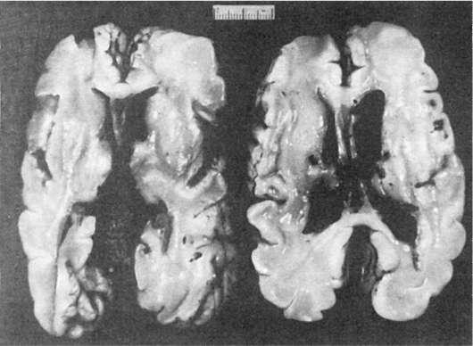 При наступлении смерти в более поздние периоды: детства у такого ребенка в головном мозге обнаруживаются поля опустошения нервных клеток или гибель их с кальцинозом, образование мелких кист, очаговый или диффузный глиоз.