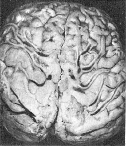 При менингококковом менингите мягкие мозговые оболочки в первые сутки от начала болезни становятся резко полнокровными, пропитаны слегка мутноватым серозным экссудатом. К концу 2-х-началу 3-х суток экссудат постепенно густеет, приобретает зеленовато-желтый цвет и гнойный характер. К 5-6-м суткам он еще более уплотняется от присоединения фибринозного выпота. Процесс начинается с базальной поверхности и переходит по перивенозным пространствам на выпуклую поверхность преимущественно