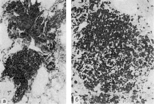 Вболее поздних фазах в межальвеолярных перегородках и альвеолах появляются милиарные узелки - бериллиевые гранулемы. В ранних стадиях гранулемы состоят из гистиоцитов, эпителиоидных клеток, небольшого числа лимфоидных, плазматических и гигантских клеток типа Лангханса или клеток инородных тел; в поздних стадиях в гранулемах появляются аргирофильные и коллагеновые волокна и узелок превращается в склеротический.