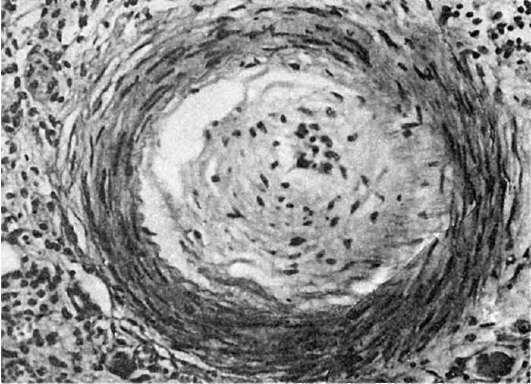Патологическая анатомия. На основании исследования биоптатов, взятых у лиц, работающих с клепальными молотками, установлено, что на почве спазма в сосудах появляются изменения типа облитерирующего эндартериита (рис. 347). В связи с наличием изменений сосудов появляются трофические изменения в коже и ногтях, развивается гангрена пальцев, ступней. Длительное давление на мышцы инструментов, изменения в спинном мозге и в соответствующих периферических нервах ведут к атрофии мышц предплечья, надлопаточной области, дельтовидной и ромбовидной мышц. В костносуставном аппарате - локтевом и плечевом суставах, костях кисти - обнаруживают повреждение сухожилий, мышц,