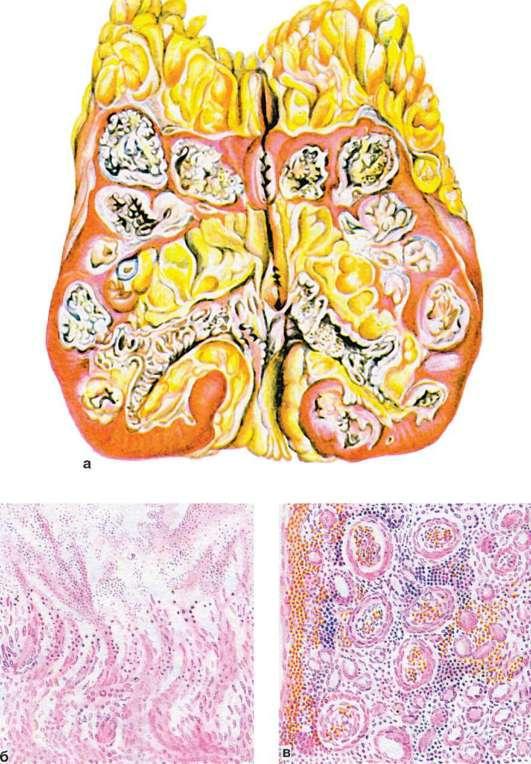а - почка на разрезе; б - стенка каверны, построенная из туберкулезных грануляций и некротических масс; в - ткань почки вне зоны туберкулезных изменений - хронический интерстициальный нефрит
