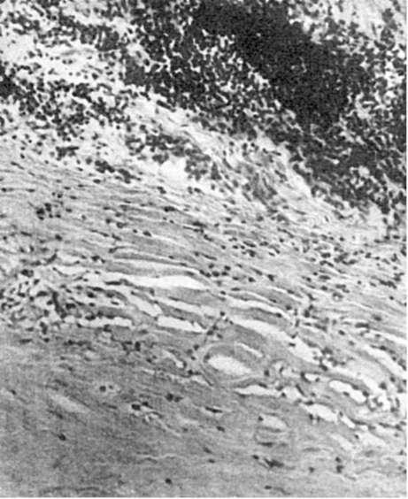 Рис. 52. Участок некроза (внизу), окруженный фиброзной капсулой (инкапсуляция некроза)