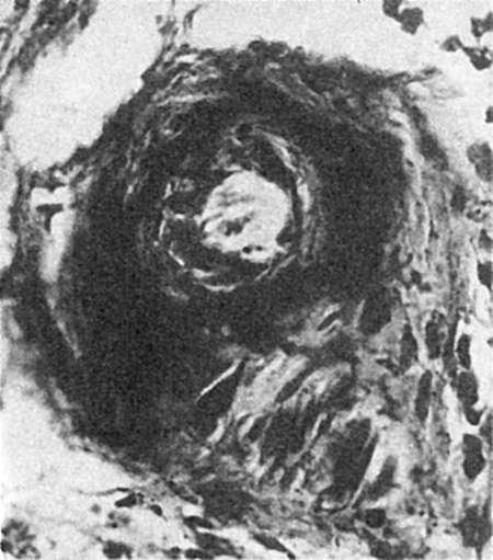 При микроскопическом исследовании плазматическое пропитывание стенки артериолы делает ее утолщенной, гомогенной (рис. 58). При крайней степени плазморрагии возникает фибриноидный некроз.