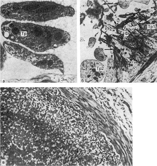 а - первая стадия образования тромба. Небольшие скопления тромбоцитов (Тр) около поврежденной эндотелиальной клетки (Эн). х14 000 (по Ашфорду и Фримену); б - вторая стадия образования тромба. В участке разрушенного эндотелия видны скопления тромбоцитов (Тр1) и фибрина (Ф); Тр2 - неизмененные тромбоциты. х7500 (по Ашфорду и Фримену); в - тромботические массы, состоящие из фибрина, лейкоцитов и агглютинирующихся эритроцитов