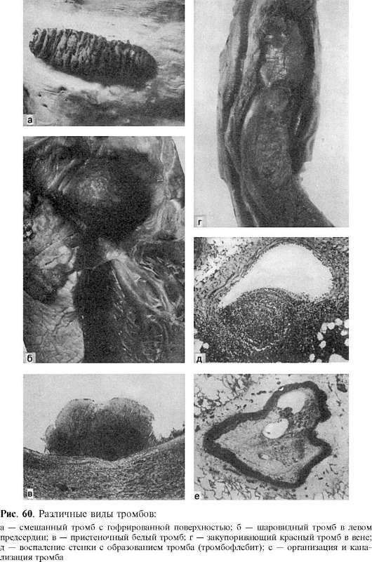 см. рис. 60), в аневризмах сердца и сосудов. Закупоривающий тромб образуется чаще в венах и мелких артериях при росте пристеночного тромба, реже - в крупных артериях и аорте.