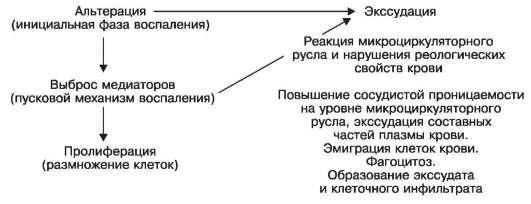Воспаление развивается на территории гистиона и складывается из следующих последовательно развивающихся фаз: 1) альтерация; 2) экссудация; 3) пролиферация гематогенных и гистиогенных клеток и, реже, паренхиматозных клеток (эпителия). Взаимосвязь этих фаз показана на схеме IX.