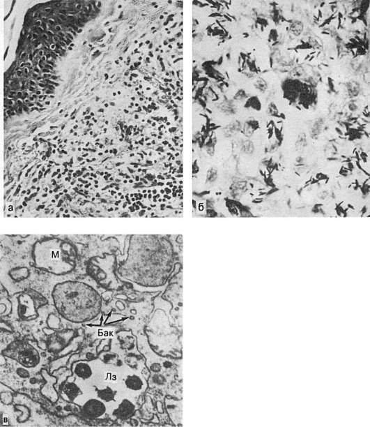 а - лепрома при лепроматозной форме; б - огромное число микобактерии в лепрозном узле; в - лепрозная клетка Вирхова. В клетке скопления микобактерий (Бак), большое число лизосом (Лз); деструкция митохондрий (М). Электронограмма. х25 000 (по Давиду)