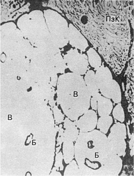 Рис. 75. Клетка Микулича при склероме. В цитоплазме видны огромные вакуоли (В), в которых содержатся бациллы Волковича-Фриша (Б). ПзК - плазматическая клетка (по Давиду). х7000