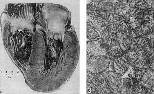 а - внешний вид; б - гиперплазия митохондрий при гипертрофии сердца. Электронномикроскопическое исследование
