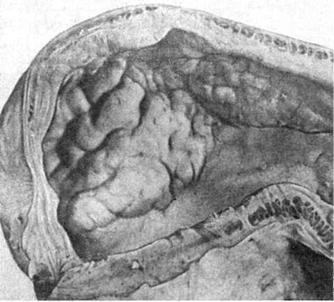 толще органа или на его поверхности. В одних случаях она диффузно пронизывает орган (рис. 94) и тогда границы ее не определяются, в других - расположена на поверхности органа (слизистой оболочки) в виде полипа (рис. 95). В компактных органах опухоль может выступать над поверхностью, прорастать и разрушать капсулу, аррозировать (разъедать) сосуды, вследствие чего возникает внутренее кровотечение. Она часто подвергается некрозу и изъязвляется (раковая язва). На разрезе опухоль имеет вид однородной, обычно бело-серой или серорозовой ткани, напоминая иногда рыбье мясо. Иногда ткань опухоли пестрая в связи с наличием в ней кровоизлияний, очагов некроза; опухоль может быть и волокнистого строения. В некоторых органах (например, в яичниках) опухоль имеет кистозное строение.