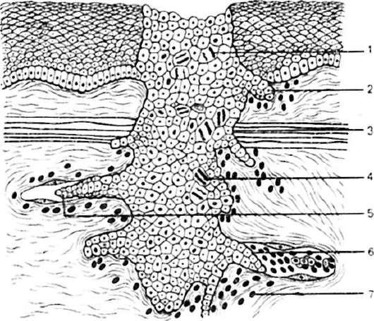 1 - атипизм и полиморфизм клеток; 2 - инфильтрирующий рост; 3 - прорастание подлежащих тканей; 4 - атипичные митозы; 5 - врастание в лимфатические сосуды - лимфогенные метастазы; 6 - врастание в кровеносные сосуды - гематогенные метастазы; 7 - перифокальное воспаление