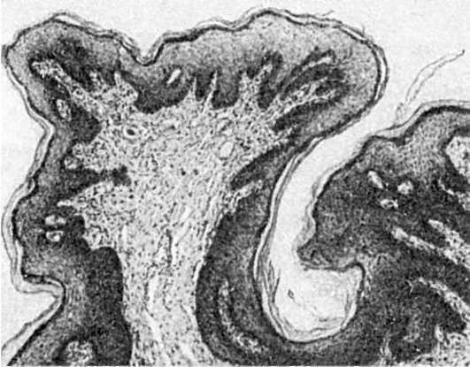 Папиллома (от лат. papilla - сосочек) - опухоль из плоского или переходного эпителия (рис. 100). Она имеет шаровидную форму, плотная или мягкая, с поверхности сосочкового вида (как цветная капуста или ягоды малины), размером от просяного зерна до крупной горошины; располагается над поверхностью кожи или слизистой оболочки на широком или узком основании. Опухоль построена из клеток разрастающегося покровного эпителия, число слоев его увеличено. В папилломе кожи может наблюдаться ороговение разной интенсивности.