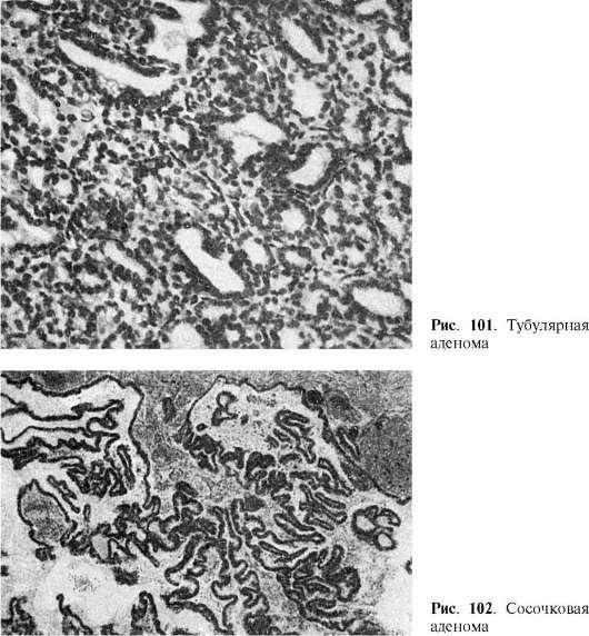 ифункциональном отношениях. В зависимости от особенностей строения, помимо фиброаденомы и аденоматозного полипа, различают: ацинарную, развивающуюся из альвеолярной паренхимы желез(альвеолярная аденома); тубулярную (рис. 101), растущую из протоков железистых структур; трабекулярную,имеющую балочное строение,