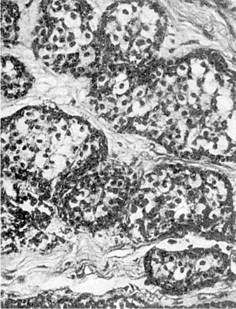 Неинфильтрирующий дольковый рак (дольковый «рак на месте») возникает мультицентрично, имеетсолидный и железистый варианты (рис. 109). Развивается в неизмененной дольке или на фоне дисгормональной доброкачественной дисплазии. Возможен переход в инвазивную форму рака.