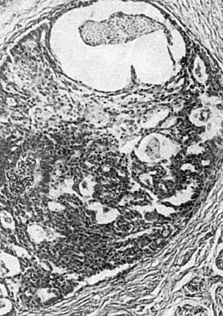 Неинфильтрирующий внутрипротоковый рак (протоковый «рак на месте») может быть сосочковым, угревидным и криброзным. Сосочковый рак растет, заполняя просвет расширенных протоков, и не выходит за их пределы. Угревидный рак возникает мультицентрично, но обычно ограничивается одним сегментом железы. Внутрипротоковые разрастания анаплазированного эпителия (рис. 110) подвергаются некрозу. Эти некротические, иногда обызвествленные, массы опухоли выдавливаются