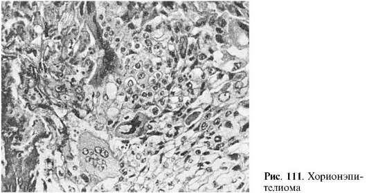 часто при деструирующем пузырном заносе. Опухоль имеет вид пестрого губчатого узла в миометрии. Ранее эту опухоль называли децидуомой, так как предполагали, что она развивается из децидуальной ткани беременной матки. В 1886 г. московский патологоанатом М.Н. Никифоров и почти одновременно швейцарский патологоанатом Маршан установили, что опухоль развивается из эпителия ворсин хориона, т.е. плода, а не матери. Опухоль была названа хорионэпителиомой. Она состоит из элементов цито- и синцитиотрофобласта (рис. 111): светлых эпителиальных клеток Лангханса, среди которых много гигантских делящихся и полиморфных темных клеток синцития. Строма в опухоли отсутствует, сосуды имеют вид полостей, выстланных клетками опухоли, в связи с этим часты кровоизлияния. Клетки опухоли легко проникают в кровь и дают гематогенные метастазы, прежде всего в легкие. Хорионэпителиома гормонально-активна: ее развитие сопровождается выделением гормона гонадотропина, который обнаруживается в моче. В очень редких случаях хорионэпителиома может иметь тератогенное происхождение, чем объясняют ее развитие у женщин в яичнике и у мужчин в яичке, средостении, стенке мочевого пузыря. Такие хорионэпителиомы называют эктопическими.