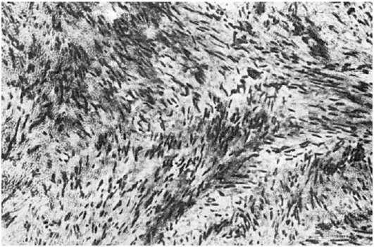 Фиброма - опухоль из соединительной (фиброзной) ткани. Представлена обычно узлом дифференцированной соединительной ткани, пучки волокон и сосудов расположены в разных направлениях (рис. 116). Различают два вида фибром: плотную с преобладанием коллагеновых пучков над клетками и мягкую, состоящую из рыхлой соединительной ткани с большим числом клеток типа фибробластов и фиброцитов.